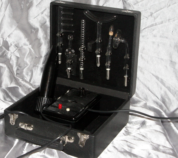 The case and interior have been lovingly restored with a faux leather black covering and a deep black cotton velvet interior. With new case clips and metalwork. The control unit (all made of bakelite) has a single knob for controlling the power - it adjusts the tension of the tremblers and gives an excellent range of sensations from low to high. There is also a voltage selector so you can choose the correct voltage for your country. Its set to UK / Europe by default. Naturally like all our devices, better results are obtained on a 240 volt supply so for those in North America an investment in a small 120V to 240V adaptor would be a good idea. They are about the size of a child's fist (40 watts) and we can also supply these on request. Naturally we have checked out the electrics and replaced the capacitor and the cables, re - insulated all the interior wiring, cleaned the tremblers and re-tuned the unit. We have fitted a UK plug - but for overseas customers we can fit anything you like - for free. Please note, with the IXU we have also isolated the output from the mains, an adjustment we only ever have to do with a few makes. |
