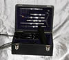 Lovely heavy duty case with new metalwork and stitched leather handle - the case covering (black faux leather) is heavy duty (as is the case) and the interior lid is in a purple cotton velvet The control unit is built into the case with a large brushed bakelite fascia and two knobs. The one on the left selects the voltage (North America OR UK and Europe) The one on the right adjusts power from medium low to high. This adjusts the contact breakers rather than a rheostat / potentiometer - but does give an excellent range of sensations. Once the power engages, you can turn it back a little to reduce power or carry on to maximum - a feature common to many quality English violet wands. Naturally we have replaced the cables with modern flexible PVC and refurbished the internal electrics to the highest possible standards allowing for the original design. This includes new capacitors, double insulated interior wiring, cleaning the contact breakers and tuning them, securing the cables so they can neither be pulled out or pushed in - plus of course, a total refurbishment of the case. |